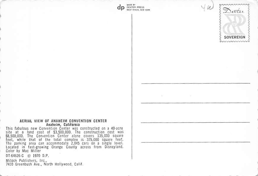 Convention Center , Anaheim, California Postcard - View Images Grade: 1 Size: C - Continental Size Postcard - approximately 4 inch X 6 inch (15 CM X 10.5 CM) Grading Scale: Grade 1 = Perfect corners Grade 2 = V ... Read More