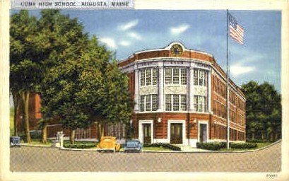 Cony High School in Augusta, Maine Postcard - Unused Grade: 1 Size: R - Regular size: Approx 3 1/2 X 5 1/2 inch (9 cm X 14 cm) Grading Scale: Grade 1 = Perfect corners Grade 2 = Very Minimal corner wear, no cr ... Read More