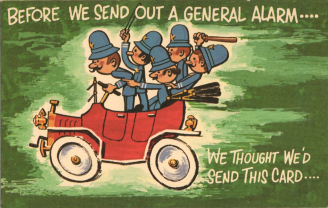 cop postcard: Before We Send Out a General Alarm