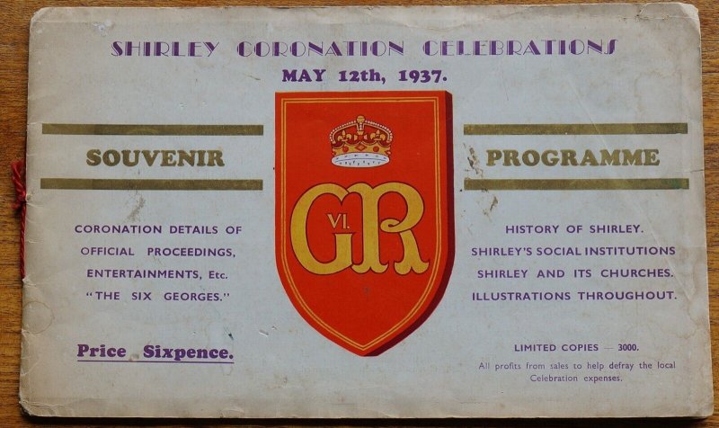 Coronation GVI, 1937, Shirley (Birmingham) Coronation Celebrations programme, 12 pages with programme of days events, Shirley Through The Ages etc. inc many local advertsCover a little scuffedPOSTAGE CAN BE COMBINED