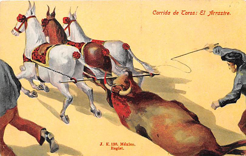 Corrida de Toros El Arrastre Bullfighting Postcard Unused, Grade: 3, , Size: Regular size: Approx 3 1/2 X 5 1/2 inch (9 cm X 14 cm) Grading Scale: Grade 1 = Perfect corners Grade 2 = Very Minimal corner wear, ... Read More