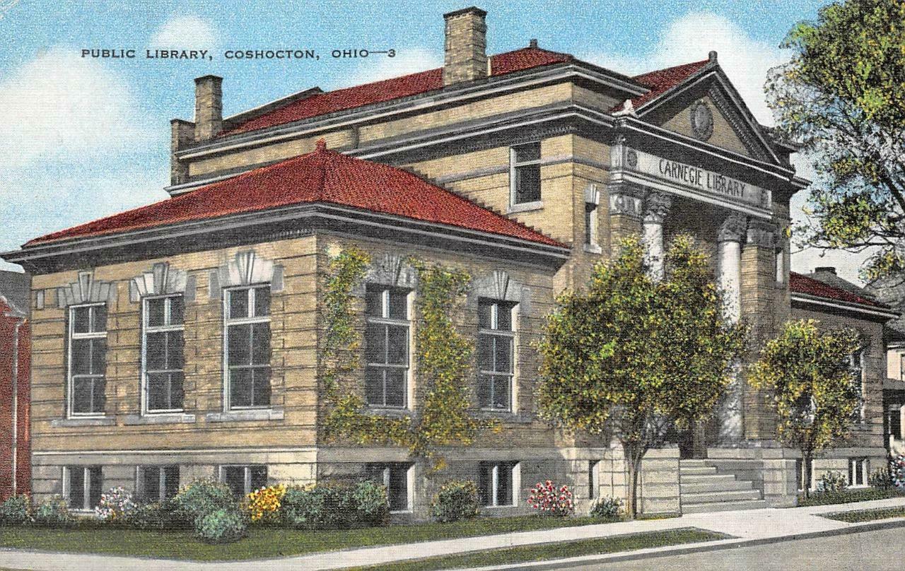 COSHOCTON, Ohio OH PUBLIC LIBRARY~Carnegie ca1940's Kropp Linen Postcard