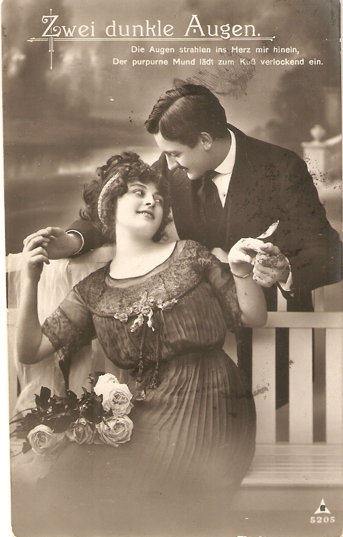 "couple. Romance with roses" vintage german postcard Publisher: : LOGO I CANNOT IDENTIFY Artist: NOT CREDITED Condition Divided. . Written on back and posted 2 FEB 1913. 5 cents Deutsche Reich stamp affixed. Goo ... Read More