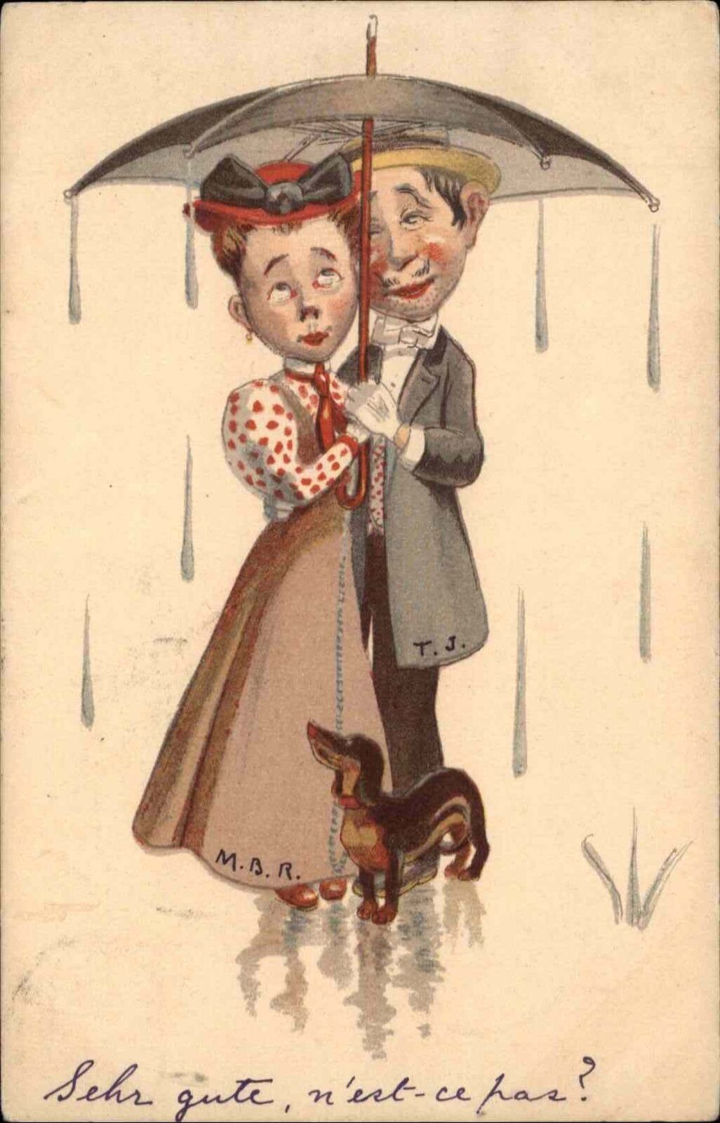 Couple Under Umbrella Walking Dachshund Dog S4189 c1910 Postcard