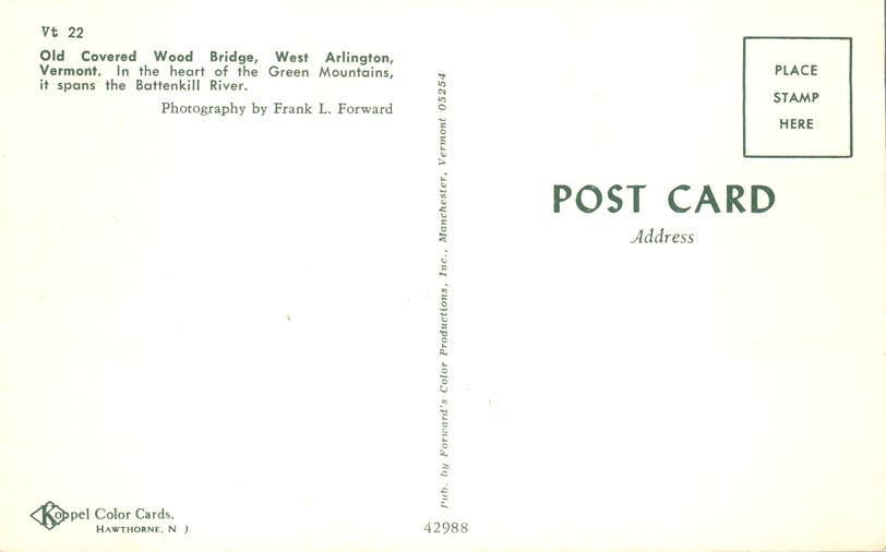 Covered Bridge over Battenkill River. West Arlington, Vermont. Standard sized chrome card. Very good condition.
