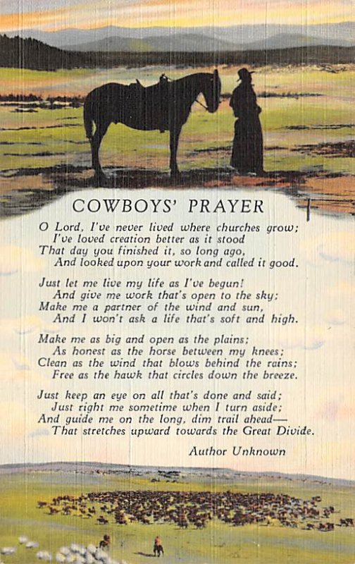 Cowboy Prayer Cowboy Postcard Unused, Grade: 2, , Size: Regular size: Approx 3 1/2 X 5 1/2 inch (9 cm X 14 cm) Grading Scale: Grade 1 = Perfect corners Grade 2 = Very Minimal corner wear, no creases Grade 3 = ... Read More
