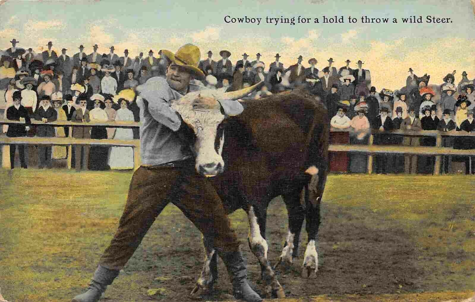 Cowboy Trying To Throw Steer Rodeo Montana 1911 postcard