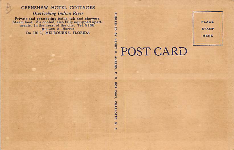 Crenshaw Hotel Cottages Overlooking Indian River Postal Date: Unused Grade: 1 - paper wear front edge Size: Regular Size Postcard - approximately 3 1/2 inch x 5 1/2 inch (9 CM x 14 CM) Grading Scale: Grade 1 ... Read More