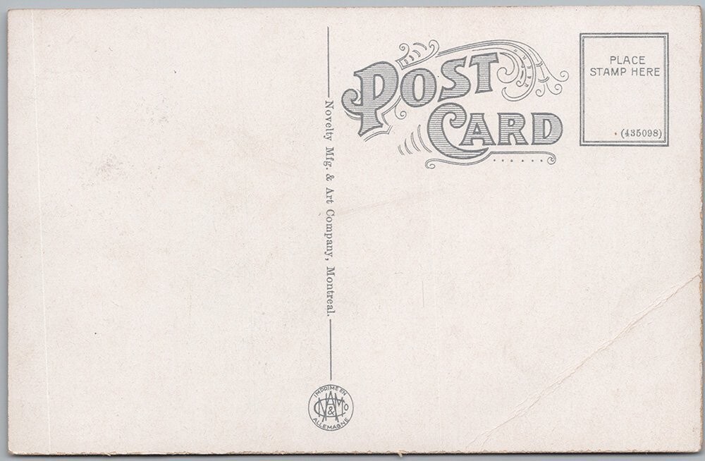 This vintage postcard features a charming lithograph view of Crescent Park in Moose Jaw, Saskatchewan, Canada. The image captures a serene landscape with a tranquil pond bordered by stone flowerbeds and a wooden bridge, set against the backdrop of historic buildings and a church tower peeking above the trees. The natural beauty and quiet elegance of this early 20th-century park scene make it a wonderful collectible for those interested in Canadian landmarks or vintage postcards.Printed by the Novelty Mfg. & Art Company of Montreal, this card is an original lithograph postcard showcasing the craftsmanship and printing techniques of its era. The card's reverse side includes the classic divided back design typical of postcards from the early 1900s, with space for a message and address. The small circular imprint at the bottom indicates it was printed in Germany, a common practice for high-quality postcards from that period. A great addition for collectors of Canadian history, vintage parks, or scenic postcards.This card has some creasing at the bottom left corner region. Please zoom into and look closely at the front and back photos to view condition and feel free to send me a message if you have any questions. Thanks kindly for viewing, D