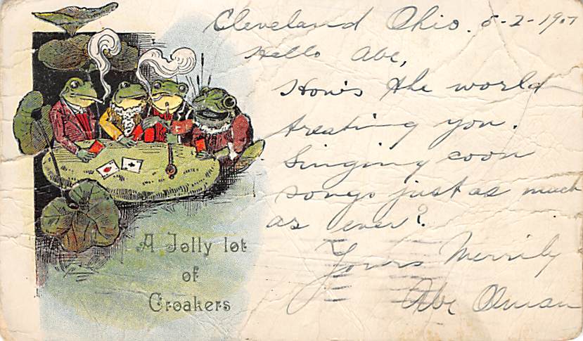 Croak Frogs Postcard 1907, Grade: 5, horrible condition, Size: Regular size: Approx 3 1/2 X 5 1/2 inch (9 cm X 14 cm) Grading Scale: Grade 1 = Perfect corners Grade 2 = Very Minimal corner wear, no creases Gra ... Read More