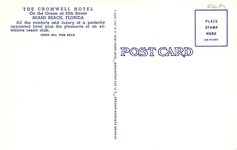 Cromwell Hotel On the Ocean Miami Beach FL Postcard - Unused Grade: 1 Size: R - Regular size: Approx 3 1/2 X 5 1/2 inch (9 cm X 14 cm) Grading Scale: Grade 1 = Perfect corners Grade 2 = Very Minimal corner wea ... Read More