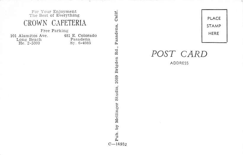 Crown Cafeteria Long Beach CA Postcard - Unused