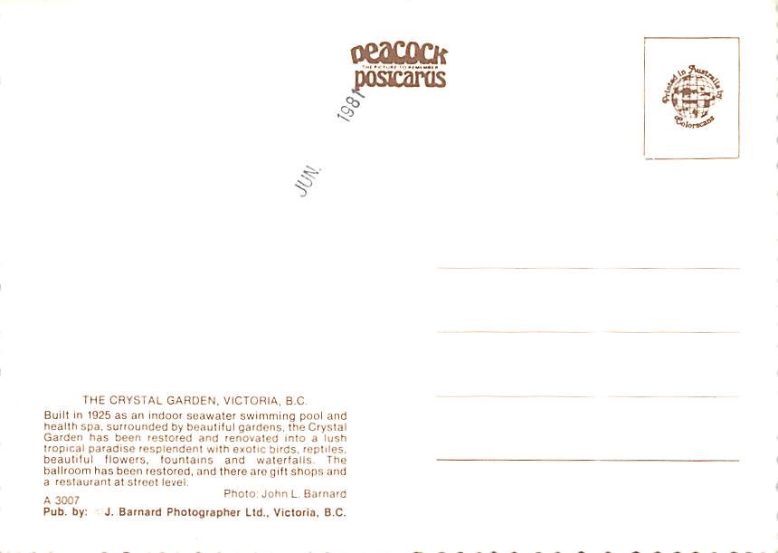 Crystal Garden - Victoria, BC, Canada Grade: 1 Category: Continental Size Postcard, Approx 4 in x 6 in (10 cm x 15.25 cm) Product Size: Continental size: 4X6 inches (10.5 cm x 15 cm) Grading Scale: Grade 1 = P ... Read More