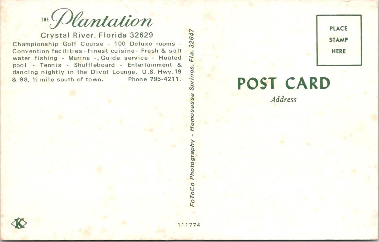 Crystal River, FL Florida PLANTATION HOTEL & GOLF COURSE ca1960's Postcard Crystal River, FL Florida PLANTATION HOTEL & GOLF COURSE ca1960's Postcard Click images to enlarge Description Please don't hesitate to send me a question, before or after your purchase. I want to make sure your experience is a positive one and will respond promptly to all inquiries. I offer a full refund if you are unhappy with your purchase, so please buy with confidence. Please Add me to your Favorite Sellers and Visit My Hip Store frequently, as new items are added every week. Images sell!Get Supersized Images & Free Image HostingCreate your brand with Auctiva'sCustomizable Templates.Attention Sellers - Get TemplatesImage Hosting, Scheduling at Auctiva.Track Page Views WithAuctiva's Counter