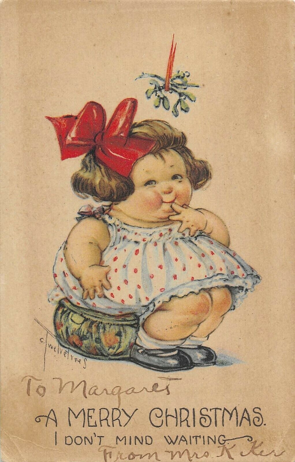 Cubby girl under mistletoe Artist signed Twelvetrees PC AD272