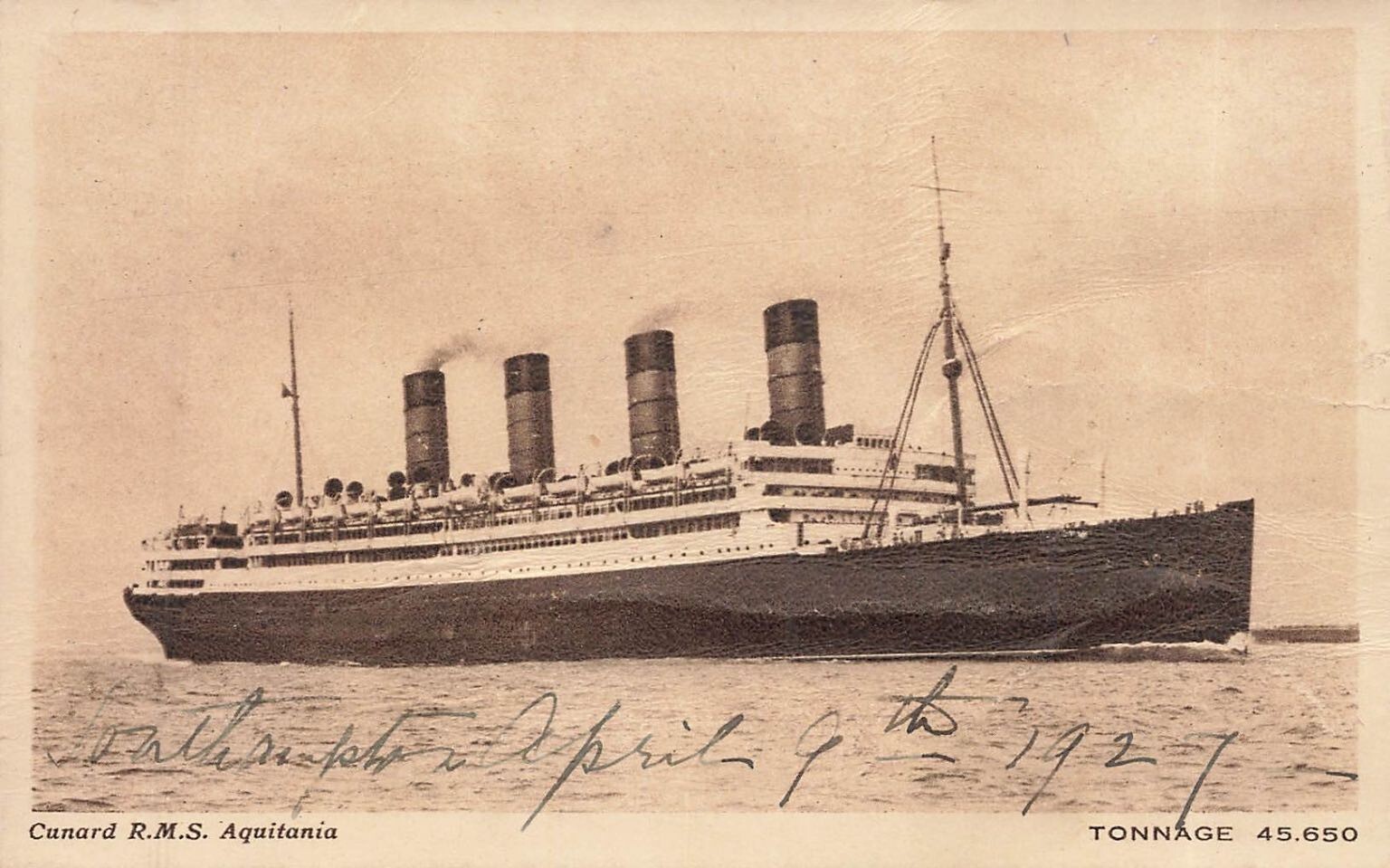 This vintage postcard features a striking sepia-toned image of the Cunard R.M.S. Aquitania, a famous British ocean liner known for its elegant design and service. The postcard showcases the ship's four iconic smokestacks and detailed deck structure, capturing the grandeur of early 20th-century maritime travel. The printed tonnage of 45,650 is noted on the front, emphasizing the ship's significant size and capacity.Printed in England, this postcard likely dates from the early 1900s, with a handwritten date of April 9th, 1927 visible on the front, adding historical context and charm. The back is divided for correspondence and address, typical of postcards from this era. This collectible item offers a glimpse into maritime history and the golden age of ocean liners, making it a valuable piece for enthusiasts of naval history, vintage postcards, and Cunard Line memorabilia.