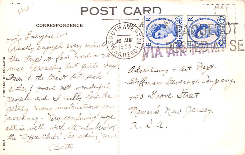 Cunard RMS Mauretania Ship Postcard 1955, Grade: 3, , Size: Regular size: Approx 3 1/2 X 5 1/2 inch (9 cm X 14 cm) Grading Scale: Grade 1 = Perfect corners Grade 2 = Very Minimal corner wear, no creases Grade ... Read More