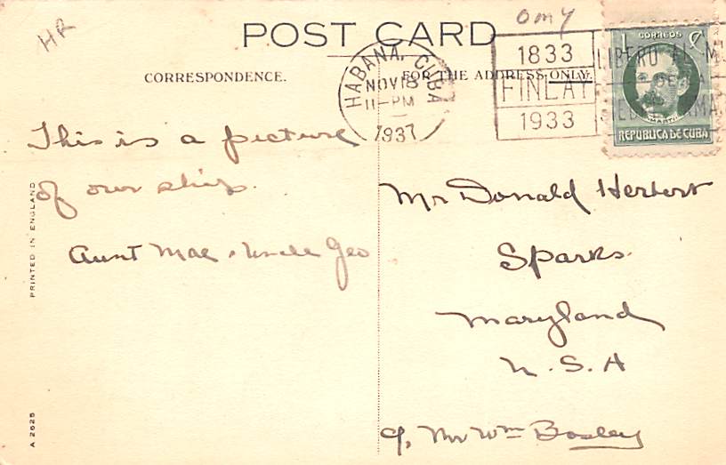 Cunard White Star, Carinthia Ship 1937 light postal marking on front