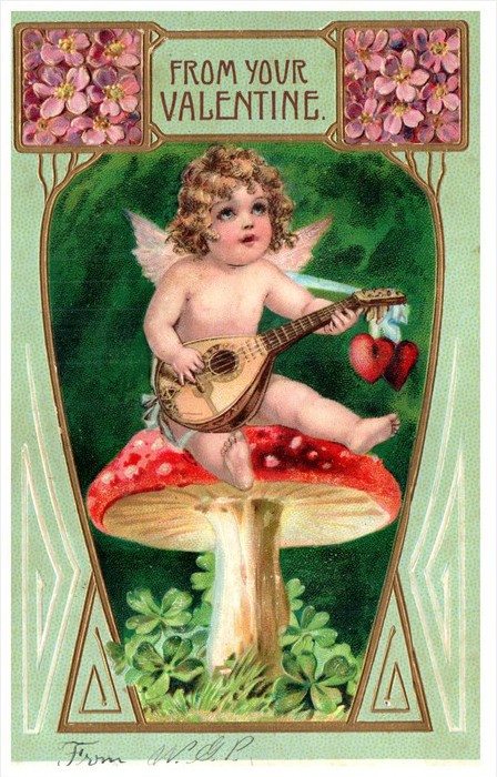 Cupid sitting on Toadstool playing Mandolin Valentine
