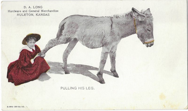 Undivided back D A Long Hardware & General Merchandise, Ruleton Kansas. Burro Series #1 Slight discoloration front and back side and corner wear bottom right.Seller Information
