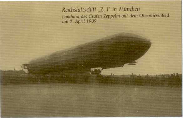 D/b blimp, airship reichsluftschiff in munchen 1909; reichsluftsciff, zi in munich landing of count zeppelin on oberwiesenfeld on 2 april 1909Type of postcard: 3 1/2 by 5 1/2 inch divided back. please note that this may be a reproduction of an earlier card. i don't know.