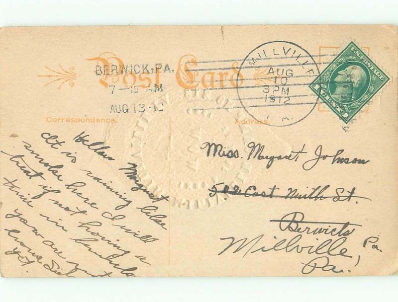 D-back postcard SENDING LEMON FRUIT Postmarked Millville & Berwick PA E9671