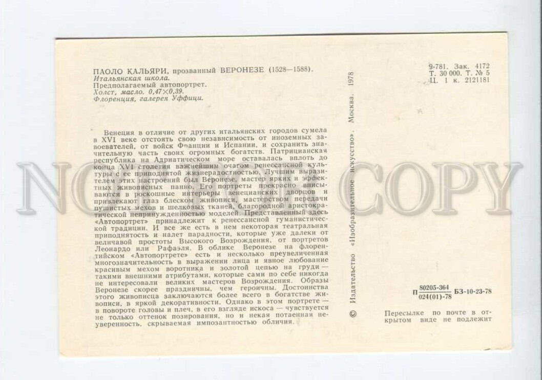 Self-portrait caliari veronese italian painter old pc Description: >>> Age: Original old postcard 1978 year >>> Approx.Size: 6X4 inches (15X10 cm) >>> Publisher: Izobrazitelnoe Iskusstvo (Fine Art), Russi ... Read More
