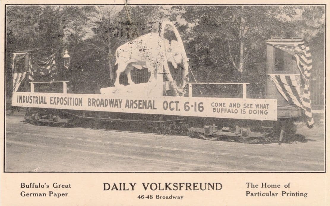 nr72 An amazing postcard from over 115 years ago which is called Daily Volksfreund and shows a transportation (surely carnival?) advertising float for a Buffalo and advertising Buffalo's Great German Paper and stat ... Read More