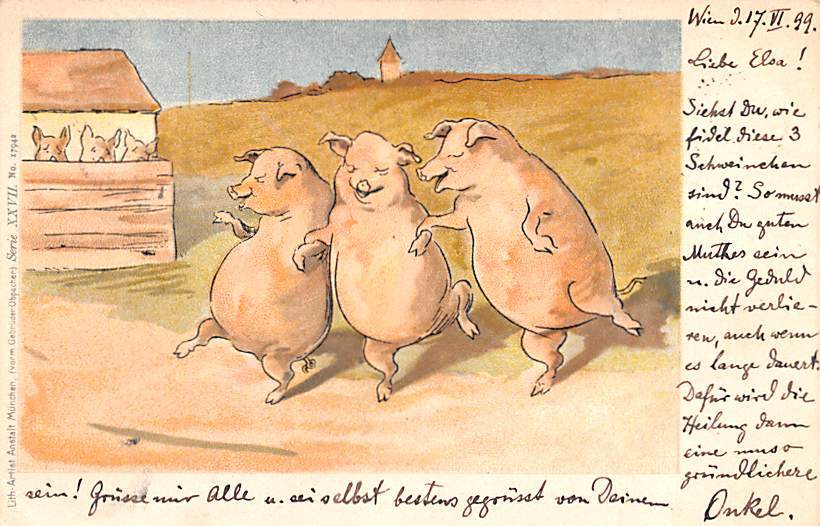 Dancing Pigs Austria Postcard Postal Date: {{Product Field 4 ( Postal Used, Unused)}} Grade: 1 Size: Regular Size Postcard - approximately 3 1/2 inch x 5 1/2 inch (9 CM x 14 CM) Grading Scale: Grade 1 = Perfe ... Read More
