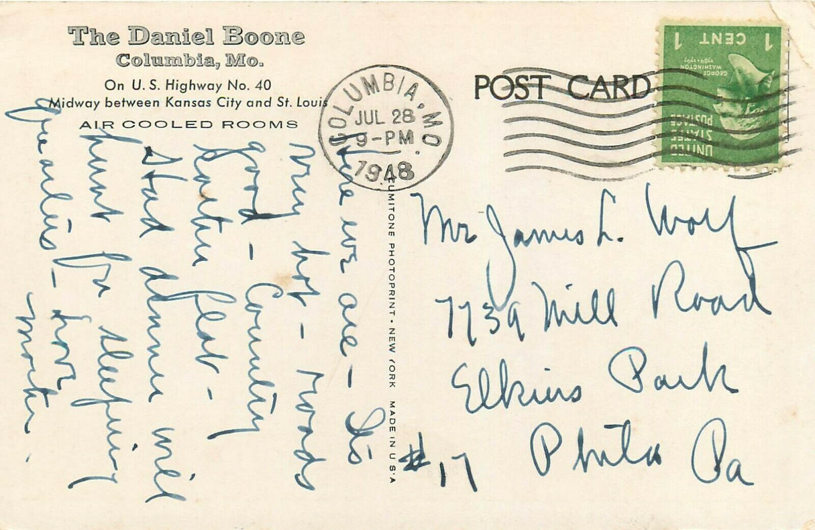 Daniel Boone Hotel Columbia Missouri pm 1948 Postcard