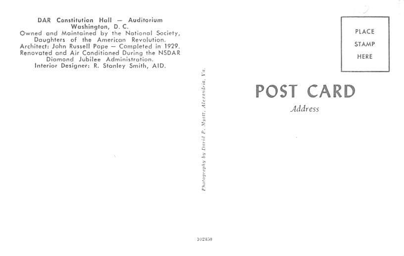 DAR Constituion Hall Washington, DC, USA Postcard Unused,