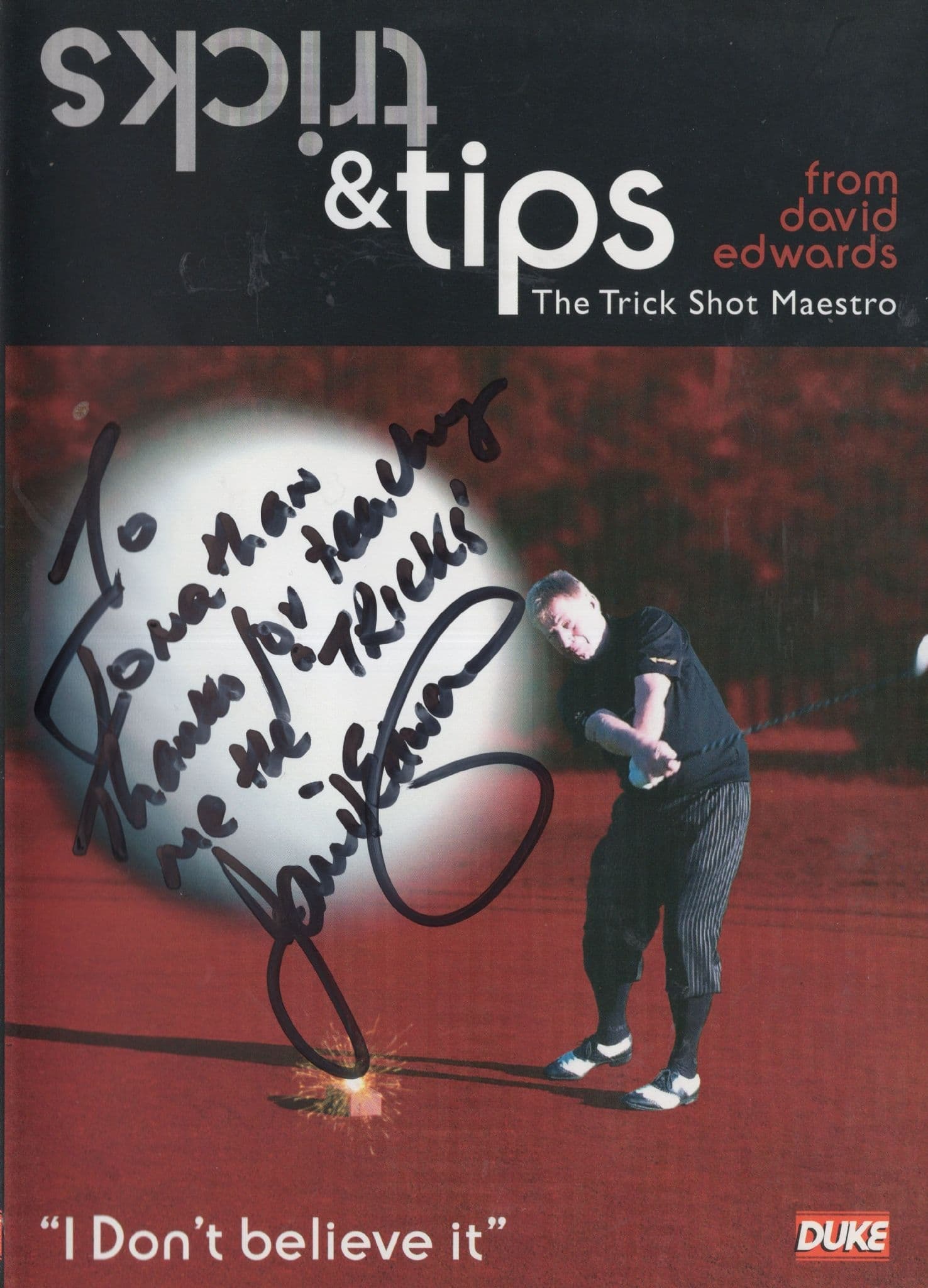 CHA0204 This is the cover of PGA leading golfer David Edwards and his DVD of how to play golf and also tips and tricks for trick shots on the course - please note you are buying the DVD cover only but the DVD can be purchased easily separately - This has been beautifully personally signed by David Edwards in strong felt pen and is great condition. It is folded where posted to me, which is how I will send to the buyer, but the fold is where the DVD edge is - it is outstanding condition.