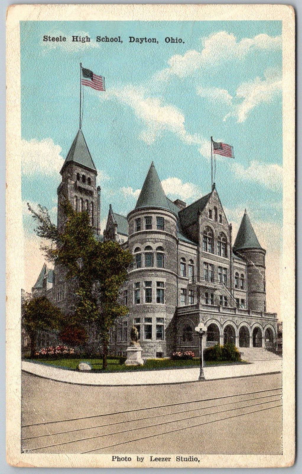 Dayton Ohio 1920s Postcard Steele High School Building Flags
