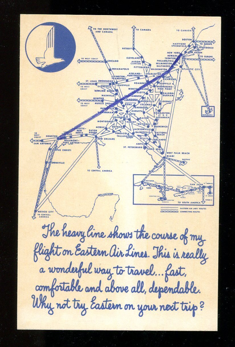 dc95 - Eastern Airlines 1960s Route Map Postcard.