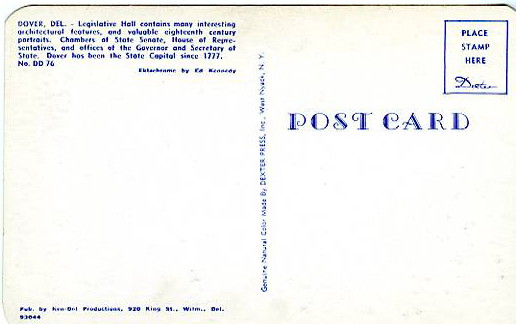DE - Dover, Legislative Hall E, Un, Db, C Grading of Postcards MINT (M): Perfect condition, no apparent blemishes, flaws, postally unused, may have some writing on back. NEAR MINT (NM): Like new, image is uncompro ... Read More
