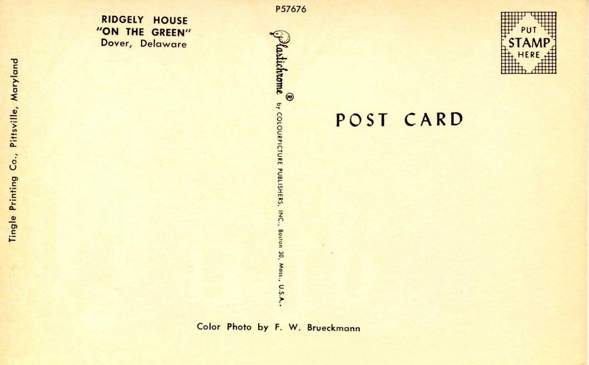 DE - Dover. The Old Ridgley House --- * Grading of Postcards MINT (M): Perfect condition, no apparent blemishes, flaws, postally unused, may have some writing on back. NEAR MINT (NM): Like new, image is uncompromi ... Read More