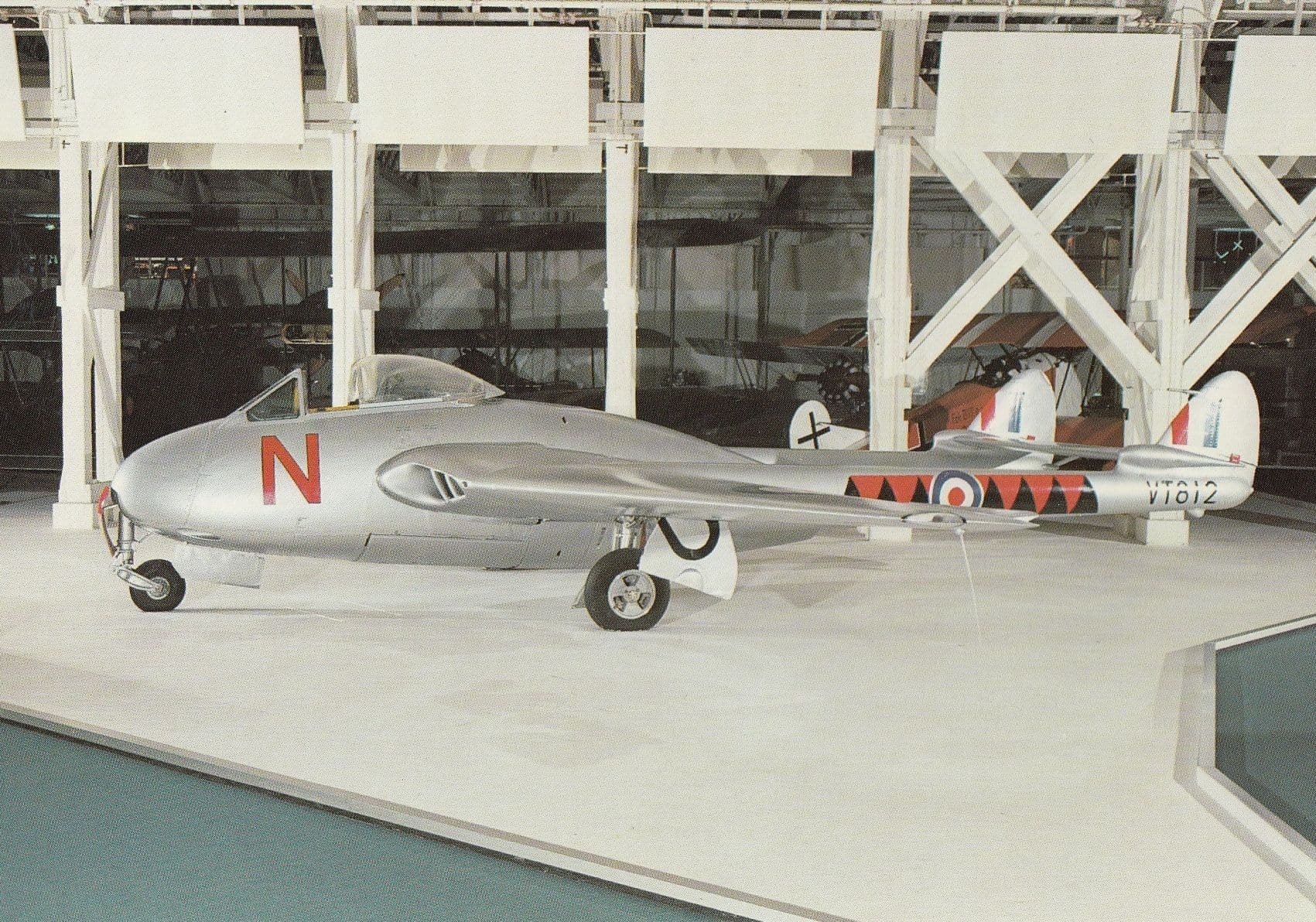 z28 x Stunning undated but appears 35 years ago origin postcard of a musuem exhibit of a De Havilland DH100 Vampire from WW2 when on display at a war museum with history of the plane on reverse unused and mint