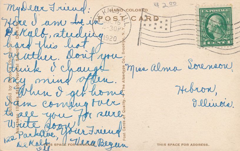 De Kalb IL - Northern Illinois State Normal School. Hand-Colored Post Cards of Quality - Albertype Co. of Brooklyn. Postmarked at De Kalb on July 16, 1920. Good to very good condition.