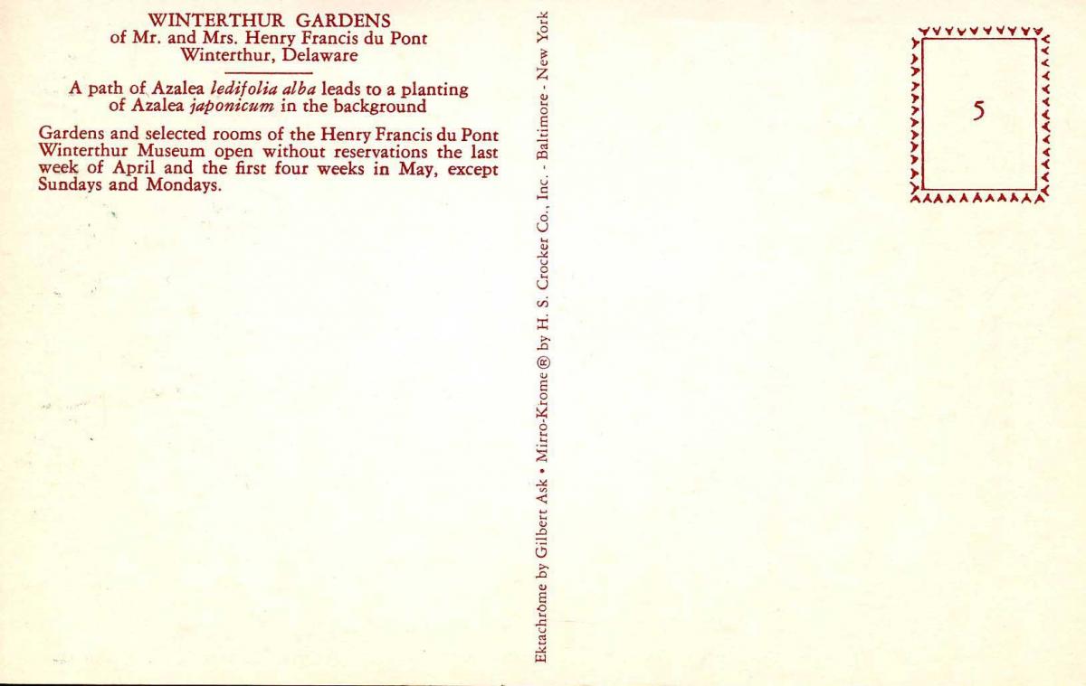 DE - Wilmington. Winterthur Gardens --- * Grading of Postcards MINT (M): Perfect condition, no apparent blemishes, flaws, postally unused, may have some writing on back. NEAR MINT (NM): Like new, image is uncompro ... Read More