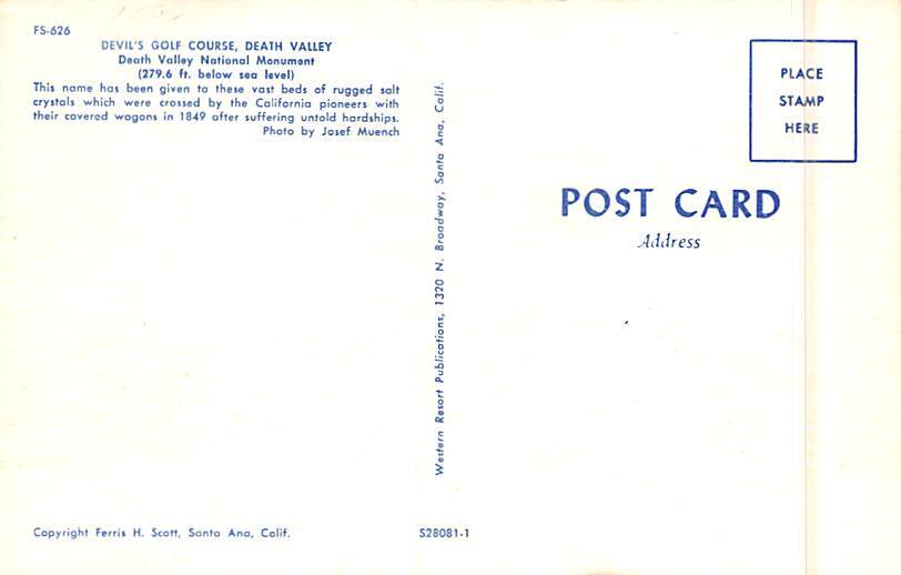 Death Valley Devil's Golf Course Death Valley CA Postcard - Unused Grade: 1 Size: R - Regular size: Approx 3 1/2 X 5 1/2 inch (9 cm X 14 cm) Grading Scale: Grade 1 = Perfect corners Grade 2 = Very Minimal corn ... Read More