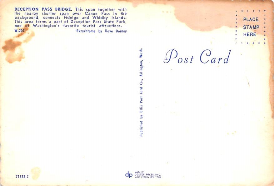 Deception Pass Bridge - Washington Grade: 3 - stains on card Category: Continental Size Postcard, Approx 4 in x 6 in (10 cm x 15.25 cm) Product Size: Continental size: 4X6 inches (10.5 cm x 15 cm) Grading Scale ... Read More