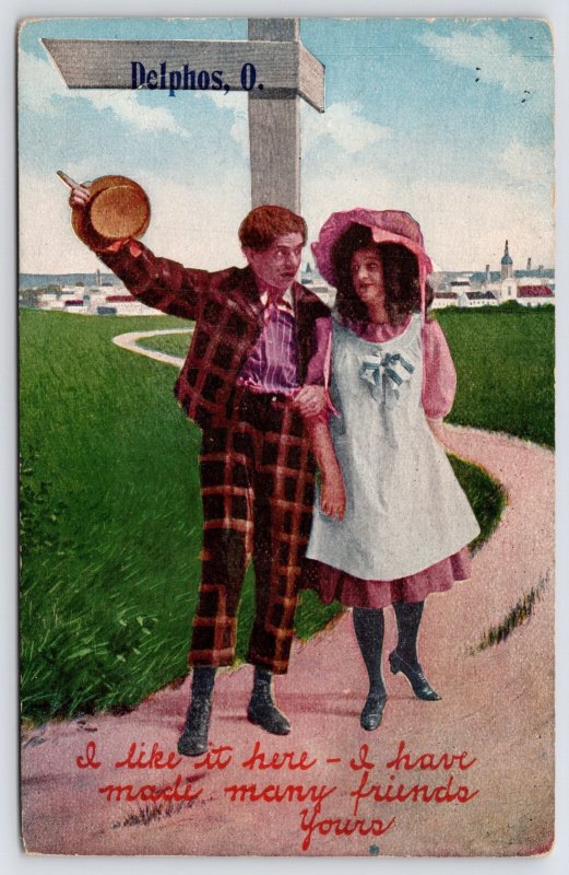Delphos Ohio~Friends Meet @ Crossroads~He Wears Plaid~She Sunhat & Apron c1908