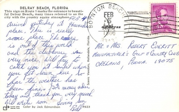 Delray Beach, FL, USA Florida Postcard - 1966 Grade: 3 Size: R - Regular size: Approx 3 1/2 X 5 1/2 inch (9 cm X 14 cm) Grading Scale: Grade 1 = Perfect corners Grade 2 = Very Minimal corner wear, no creases G ... Read More