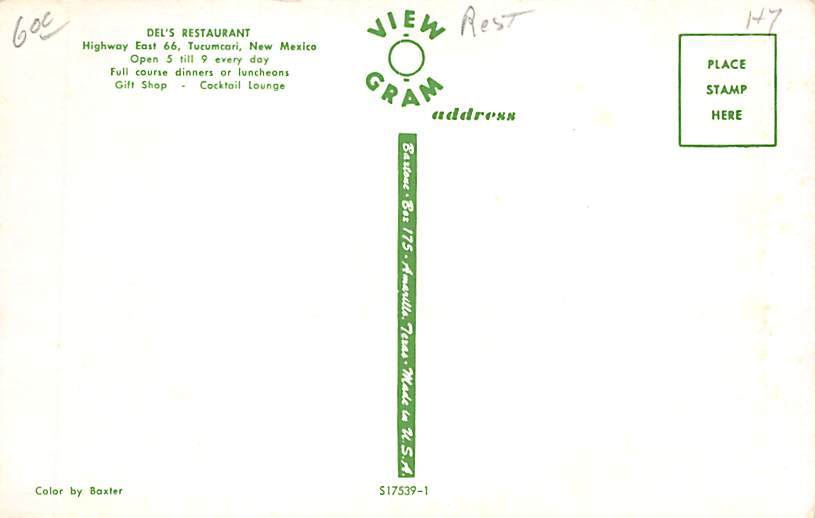 Del's Restaurant Tucumcari, New Mexico NM Postcard - Unused Grade: 2 Size: R - Regular Size Postcard - approximately 3 1/2 inch x 5 1/2 inch (9 CM x 14 CM) Grading Scale: Grade 1 = Perfect corners Grade 2 = Ver ... Read More