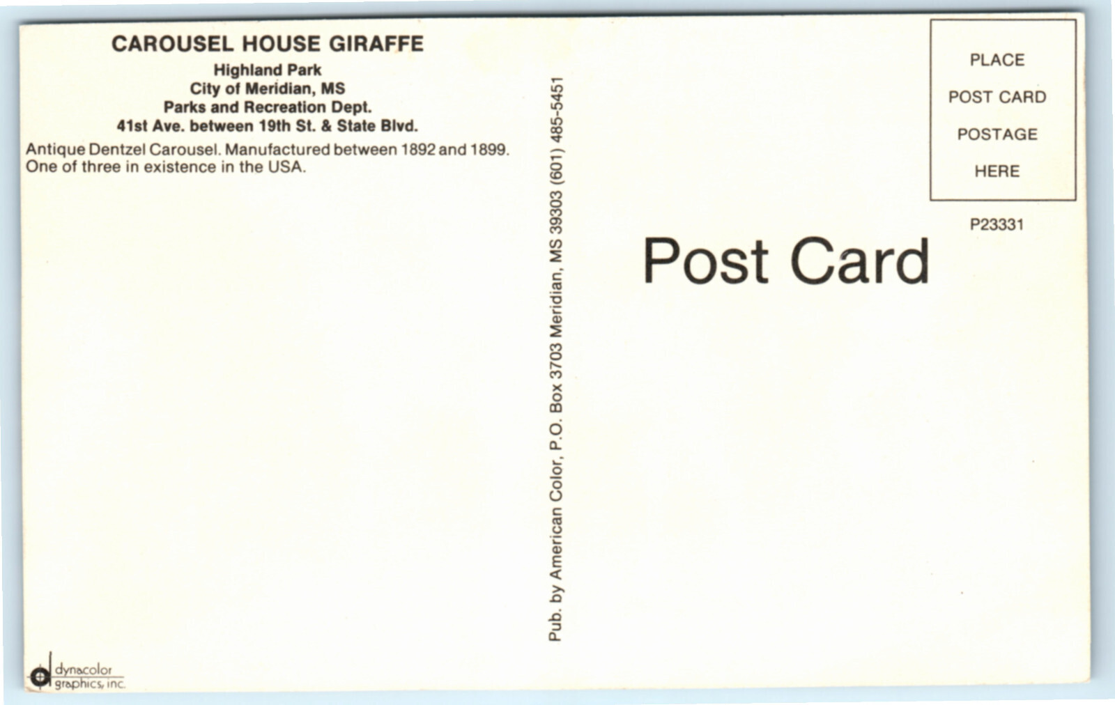 Dentzel Carousel Giraffe Meridan MS Mississippi Postcard