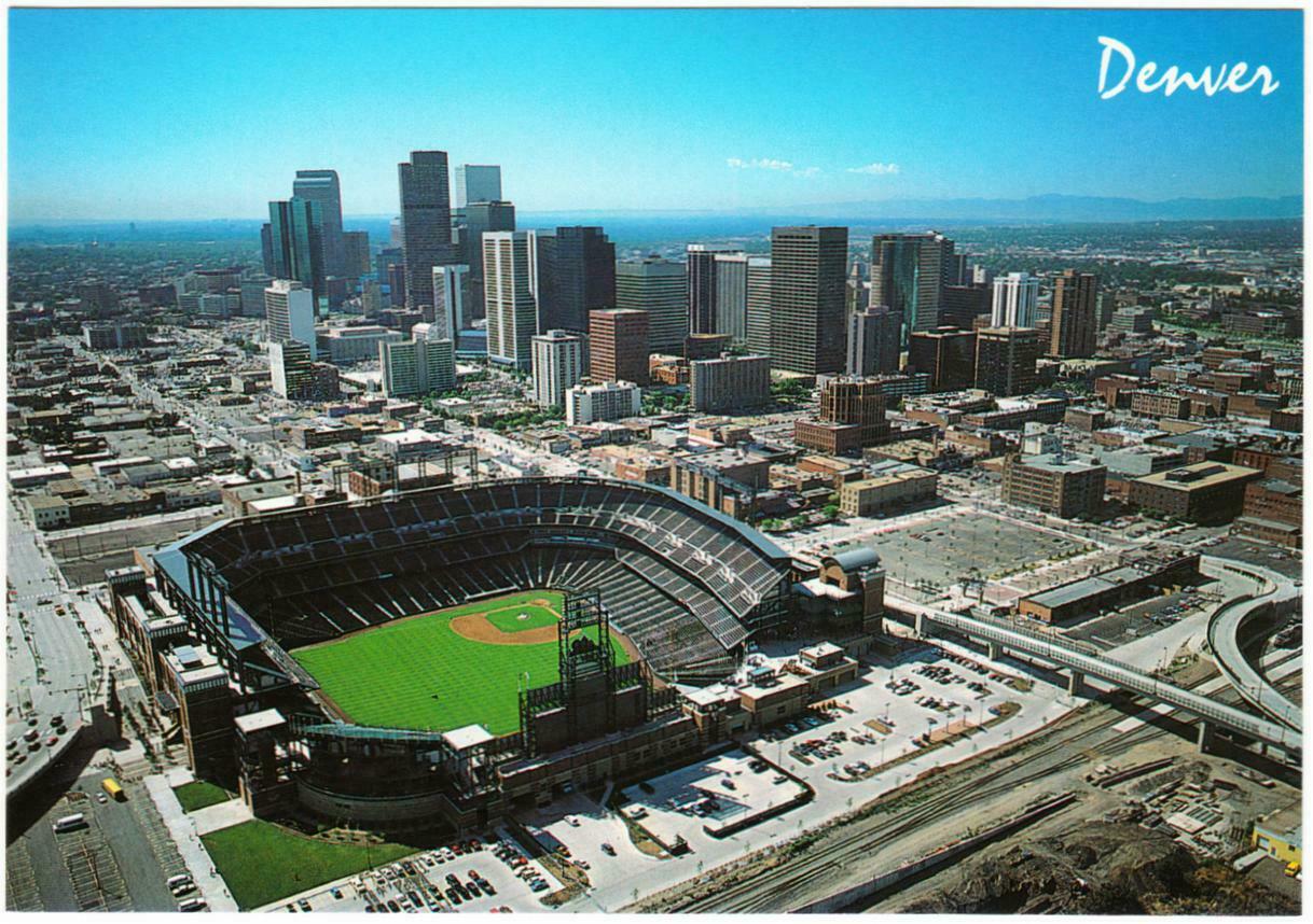 A postcard showing an aerial view of Coors Field in Denver, home of the Colorado Rockies, which opened in 1995.