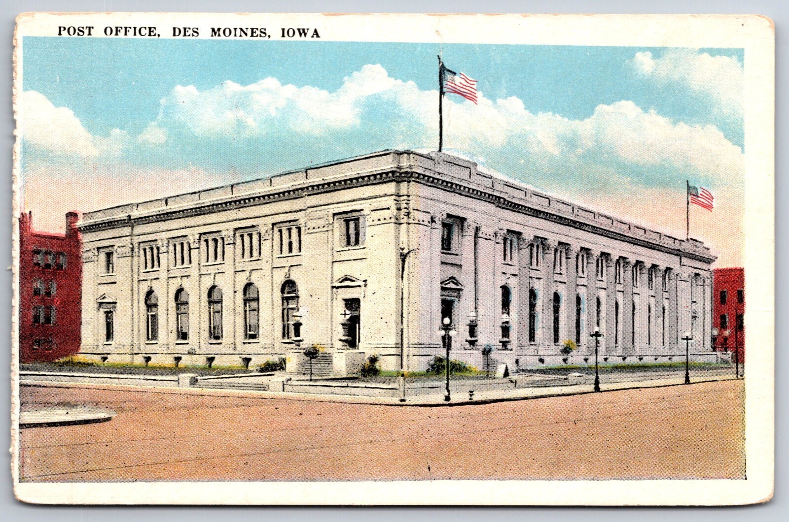 Des Moines Iowa~US Post Office On Corner~Vintage Postcard