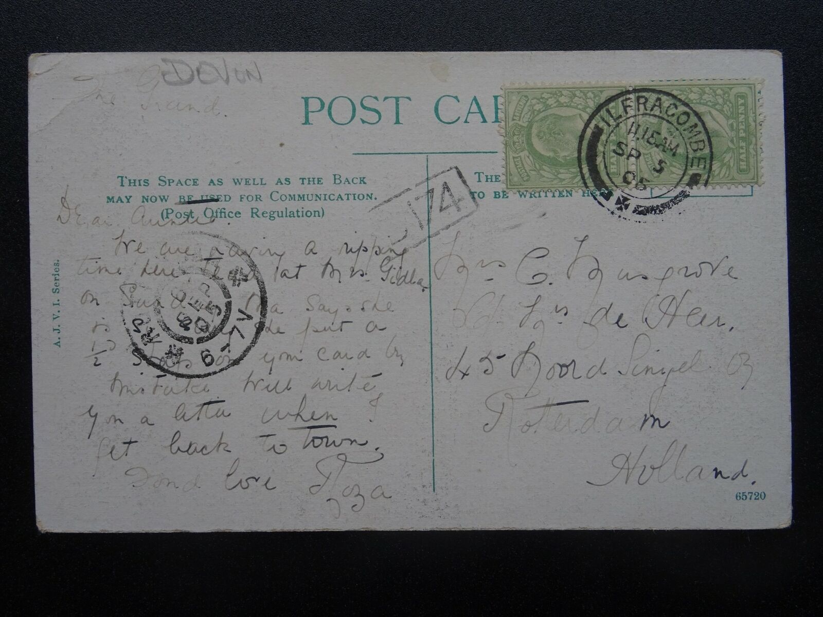 Devon ILFRACOMBE LEE Giddey's Tea House c1905 Postcard by A.J.V.I. Series Devon ILFRACOMBE LEE Giddey's Tea House c1905 Postcard by A.J.V.I. Series Postcard Details Additional Information - Postcard Condition (G) - Good / corner bend top leftPostally used - Postcard Details - Please see detail on the photographic image or contact us for details. Abbreviations: (UB) Undivided Back / (RP) Real Photograph Postcard / (PM) Postmark Interest / (CDS) Cancellation Date Stamp / (SQC) Squared Circle / (DP) Duplex PostmarkPTP Reference - 051118 Postcards WelcomeWelcome to our store. At Past Time Postcards we stock a comprehensive range of British antique and vintage topographical postcards, cigarette cards, rare antique prints and other antique collectables.We aim to make your shopping experience enjoyable and stress free. We list our postcards topographically and by subject matter to make it easier for you to locate the items that interest you. Feel free to browse and explore at your leisure, however if you require assistance locating items or have a specific request please don't hesitate to contact us.Combined Postage We will always combine postage when you purchase multiple items. Please make your multiple purchases by using your Hip BASKET where postage will be combined automatically.Postage & PackagingPostage rates are calculated to include postage and packaging. All Full Sets of Cigarette or Trade Cards are posted 1st Class and protected with a plastic sleeves in a BOARD BACKED ENVELOPE & FULL SET HAVE ADDED STIFFNER BOARD for added security and protection. Payment MethodsOur preferred method of payment is through PayPal for all purchases.UK CUSTOMERS can make payment by PayPal, Personal Cheque or Postal Order. PLEASE NOTE: Credit cards included in PayPal payment method Inc. Visa, MasterCard, American Express, Discover. FOR CUSTOMERS OUTSIDE THE UK: we can only accept PayPal as method of payment100% SatisfactionIf in the unlikely event you are unhappy with your item you have purchased on the basis that the postcard was incorrectly described or graded we do offer a complete refund less the cost of postage and packaging once the item is returned to us.Condition & Grading Information(M) Mint – Like new, almost perfect(EX) Excellent – No obvious flaws, sharp corners, clean and if postally used the writing does not detract from appearance.(VG) Very Good - Minor defects such as album marks, signs of age and handling is acceptable that do not detract from appearance.(G) Good – Noticeable defects, handling and wear apparent. Minor creasing or minor postal damage not detrimental to image.(F) Fair – Obvious creasing, staining, small tears or damp damage evident. Significant edge or corner damage.(P) Poor – Incomplete or image seriously affectedFinally if you have any specific requests or questions we are always very pleased to offer support and assist you with your collecting needs.Kind regardsMark - Past Time Postcards Listing and template services provided by inkFrog