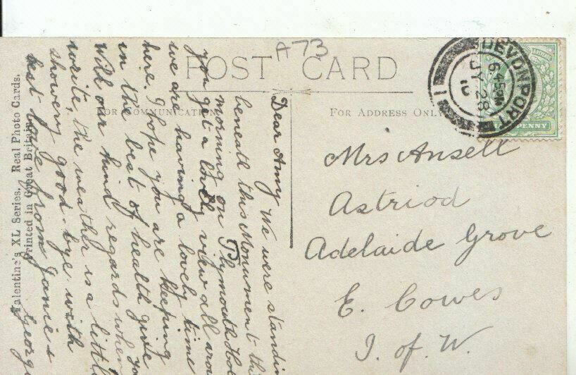 Mo's Postcards Postcard Description: Drake Monument - Plymouth - Real Photograph Genealogy Information: Used - 1910? Mrs Ansell, Astriod, Adelaide Grove, E. Cowes, I of W Defects: Postage & Payment: For U.K resident ... Read More