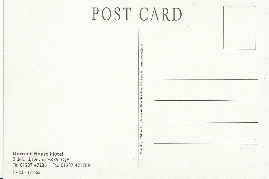 Mo's Postcards Title: Devon Postcard - Durrant House Hotel - Bideford Publisher: As seen in the scanned image Postally Used: Unused Defect(s): Postage & Payment: For U.K residents the quoted P & P fee is for any num ... Read More